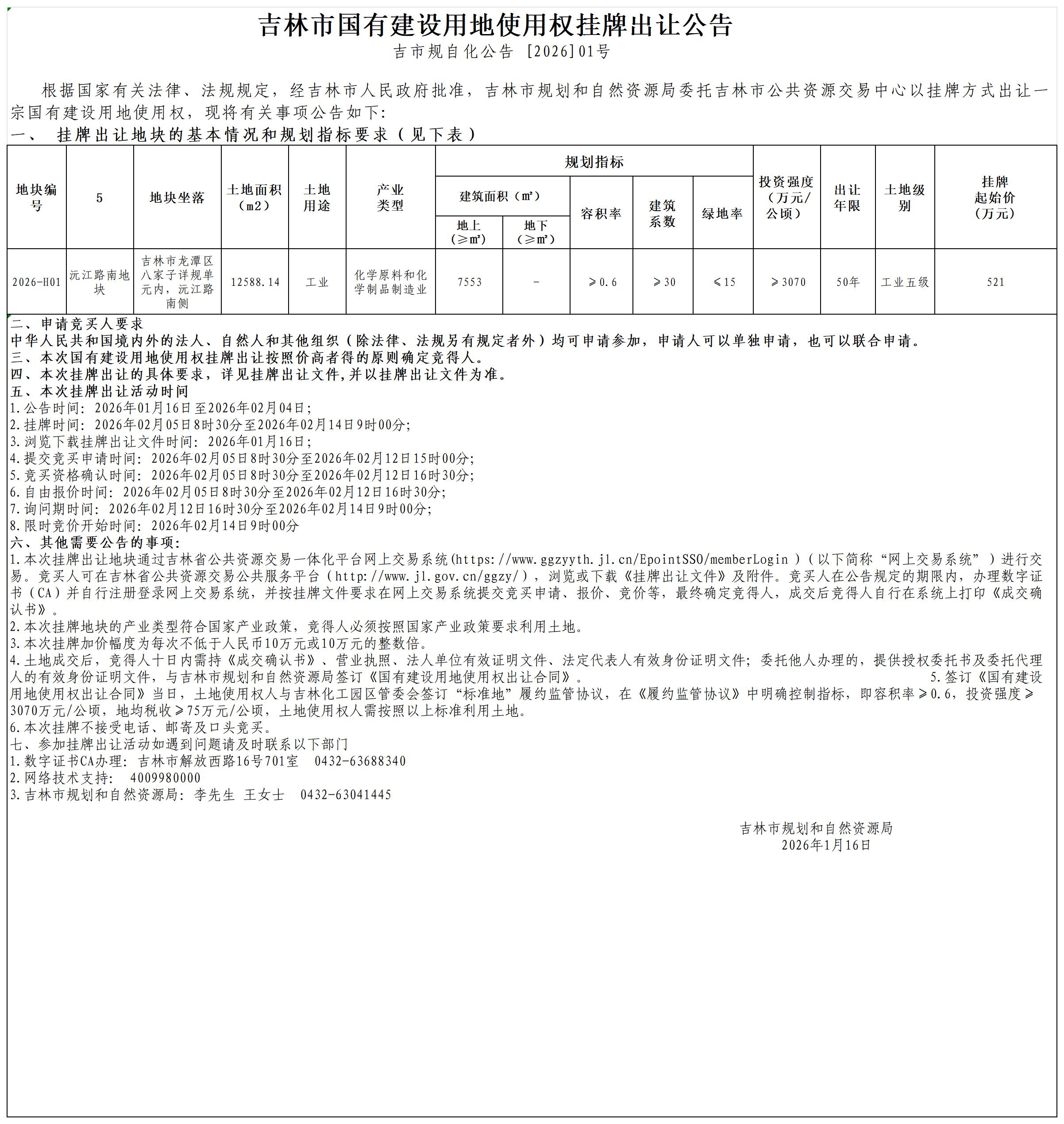 吉林市国有建设用地使用权挂牌出让公告(吉市规自化公告 [2026]01号)