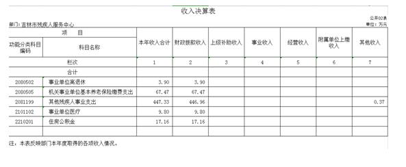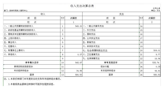 2021年度收、支总计各580.53万元。与2020年相比,收、支总计各减少69.55万元,降低10%。主要原因:残疾人事业项目减少。
