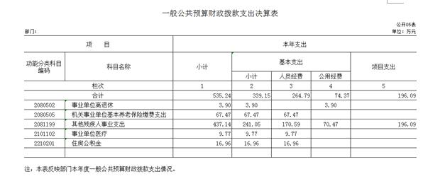 2021年度一般公共预算财政拨款支出535.24万元,占本年支出合计的99%。与2020年相比,一般公共预算财政拨款支出减少165.53万元,降低24%。主要原因:残疾人事业项目减少。