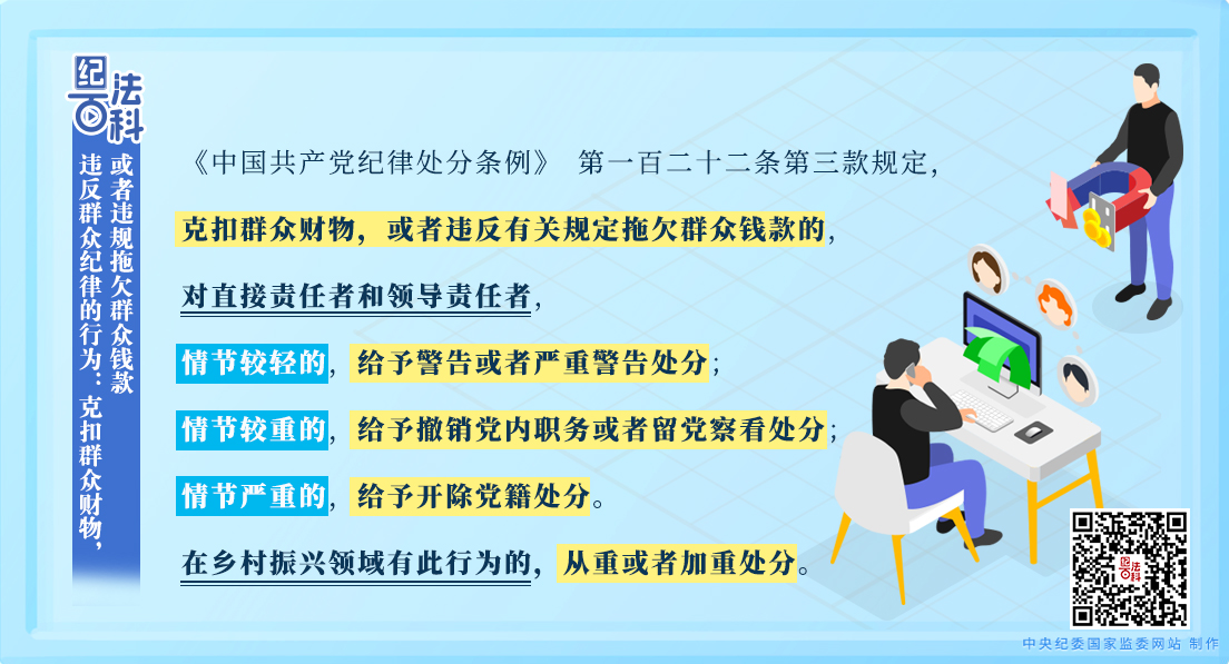 《中国共产党纪律处分条例》 第一百二十二条第三款规定,克扣群众财物,或者违反有关规定拖欠群众钱款的,对直接责任者和领导责任者,情节较轻的,给予警告或者严重警告处分;情节较重的,给予撤销党内职务或者留党察看处分;情节严重的,给予开除党籍处分。在乡村振兴领域有此行为的,从重或者加重处分。