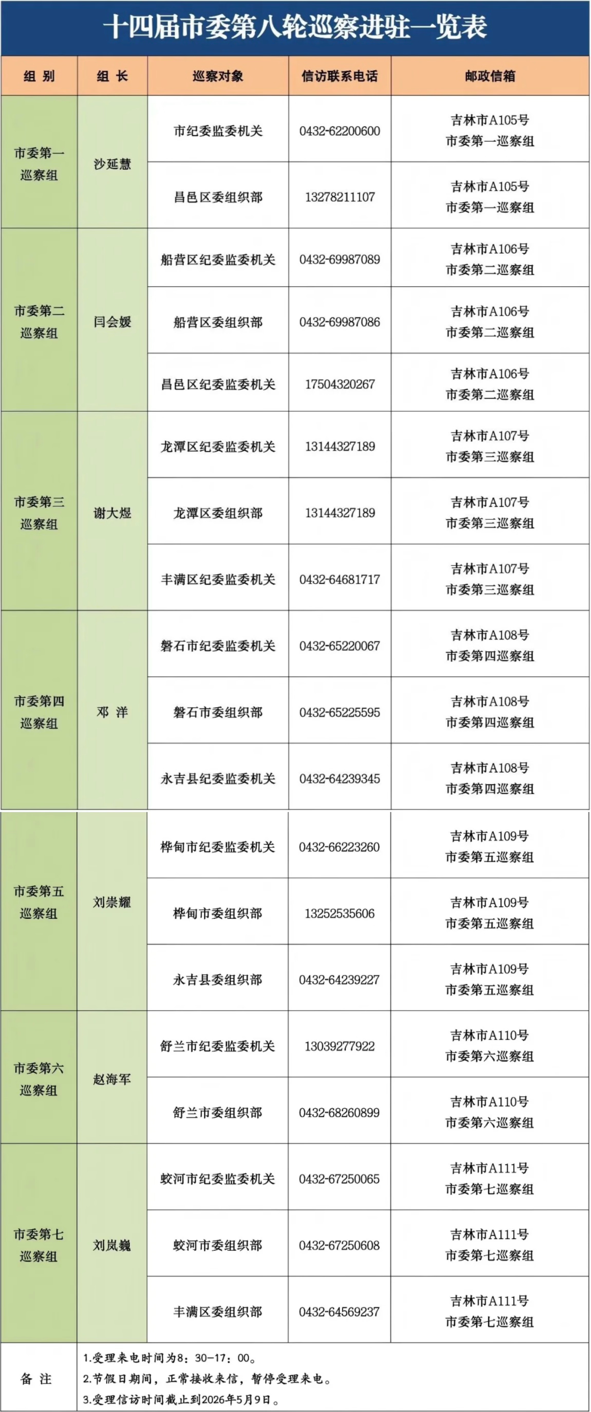 据悉,各市委巡察组现场巡察两个月左右,巡察期间设立信访联系电话和邮政信箱,主要受理反映被巡察党组织领导班子及其成员、下一级党组织主要负责人和重点岗位人员问题的来信来电来访,重点是关于违反政治纪律、组织纪律、廉洁纪律、群众纪律、工作纪律和生活纪律等方面的举报和反映。巡察组受理信访时间截止到2026年5月9日。